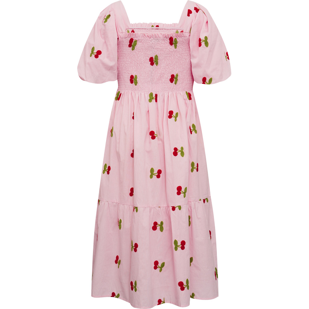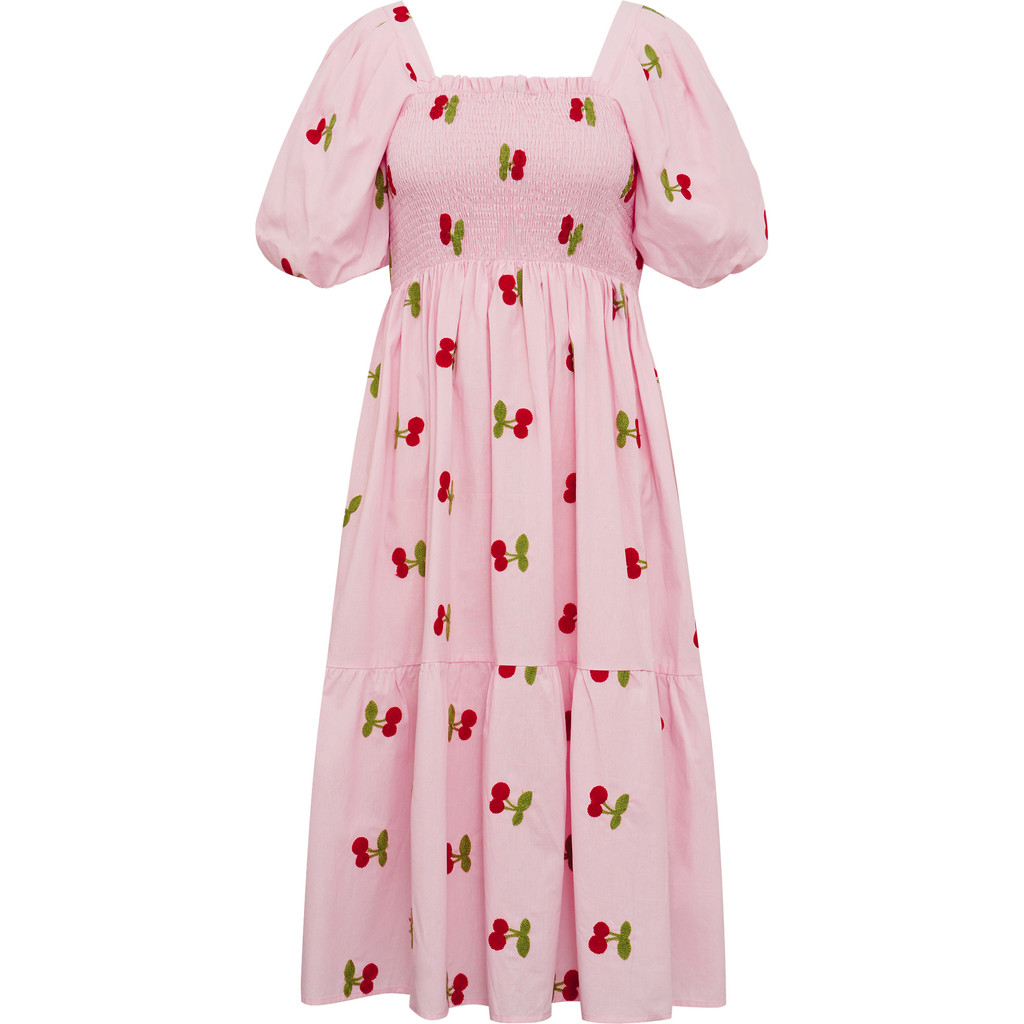 Cheri-mekko on naisellinen midimittainen mekko kevyestä ja miellyttävästä materiaalista, jossa on kaunis brodeerattu kirsikkakuvio. Mekossa on puhvihihat sekä kevyesti korostettu vyötärö, joka luo imartelevan siluetin.