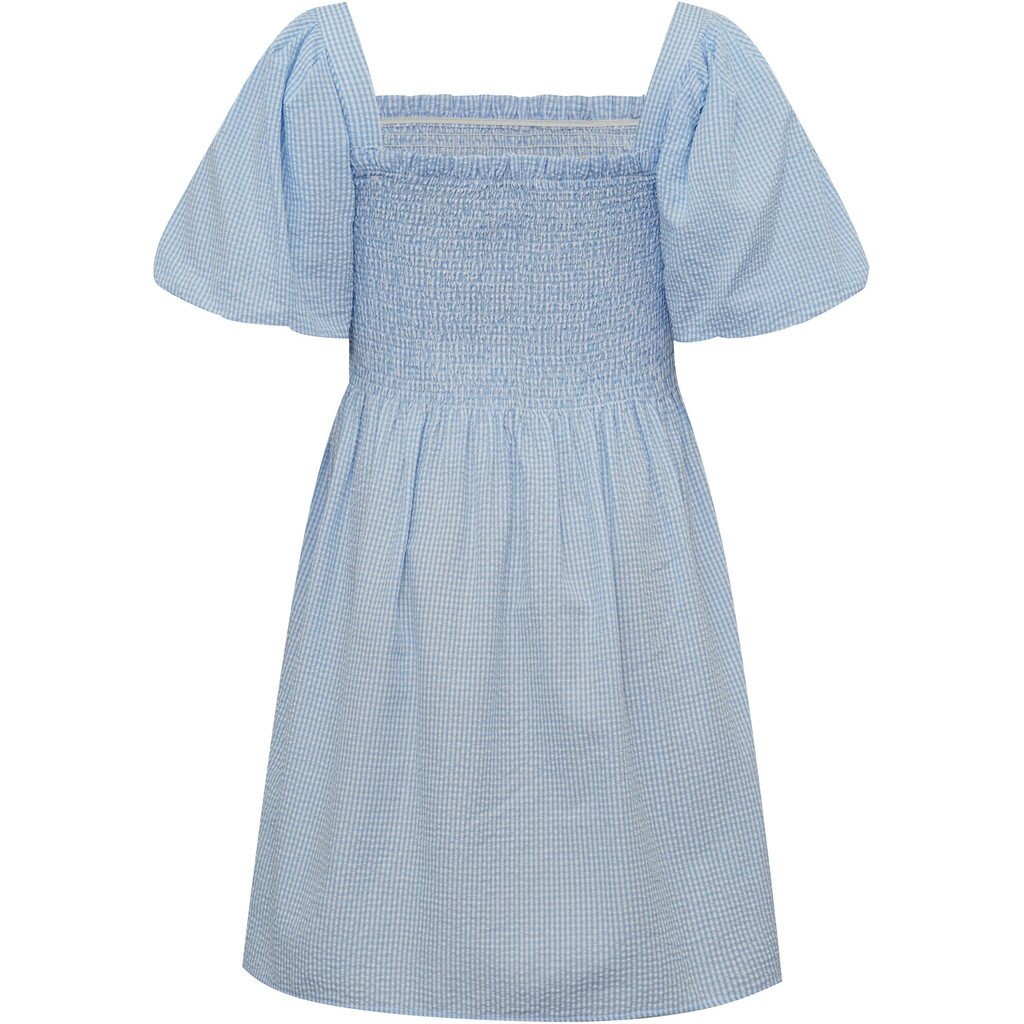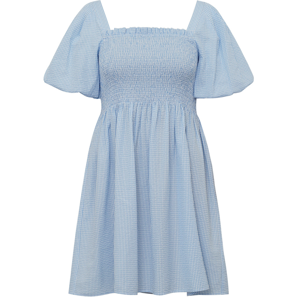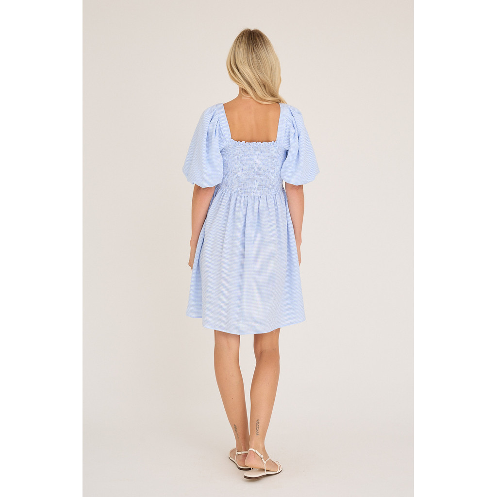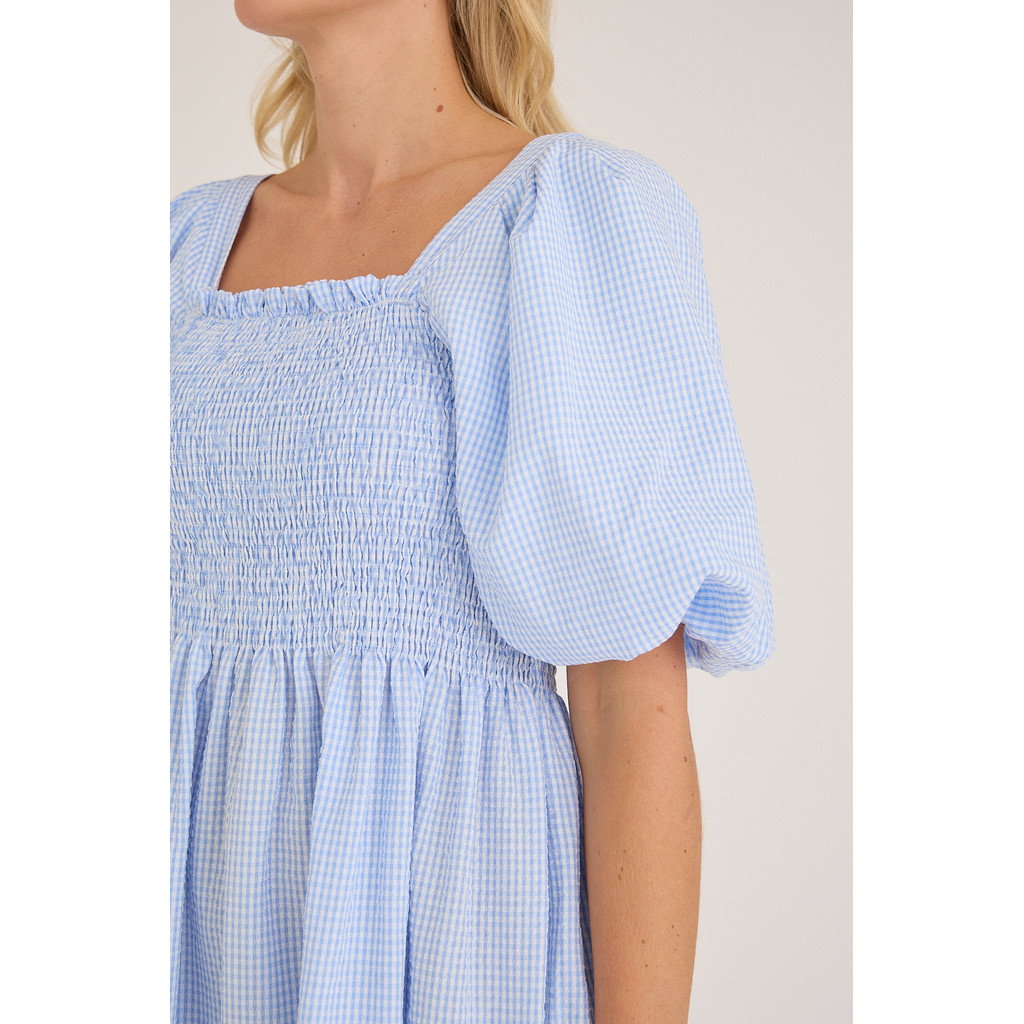Cheri-klänningen är en feminin kort klänning i ett lätt och behagligt material. Klänningen har puffärmar samt en rynkad byst som skapar en smickrande silhuett.