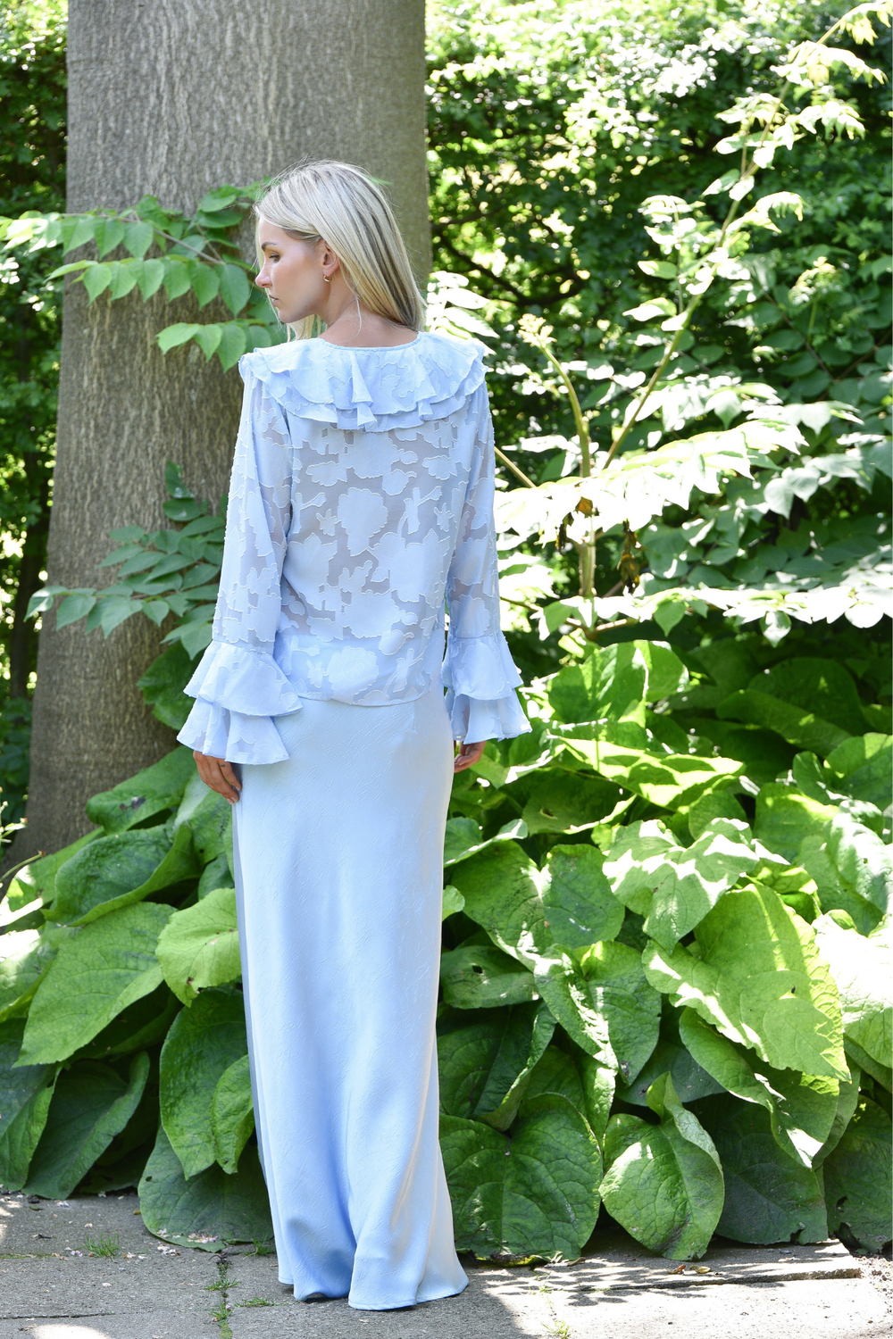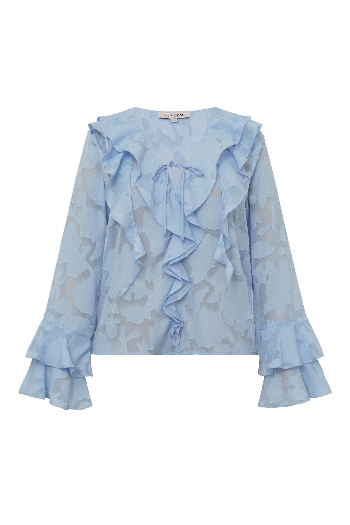 Floretta-blusen är en elegant blus i ett lätt transparent material med volangdetaljer framtill och vid ärmsluten. Den har v-ringning med knytband samt långa, voluminösa ärmar.