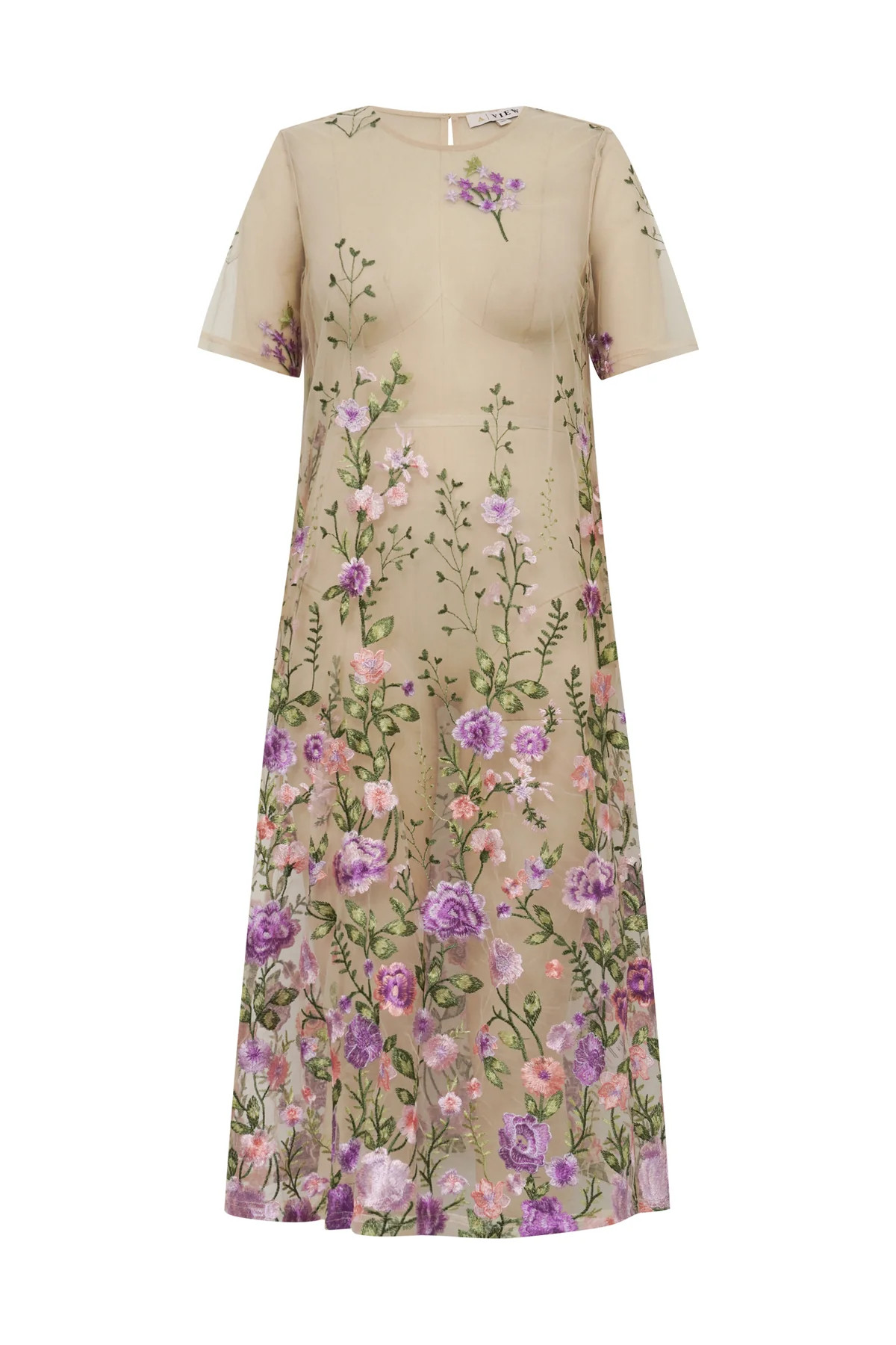 Fuchsia midiklänning är en vacker midi-klänning i transparent mesh med broderade detaljer. Klänningen har korta ärmar och stängs baktill med en knapp.