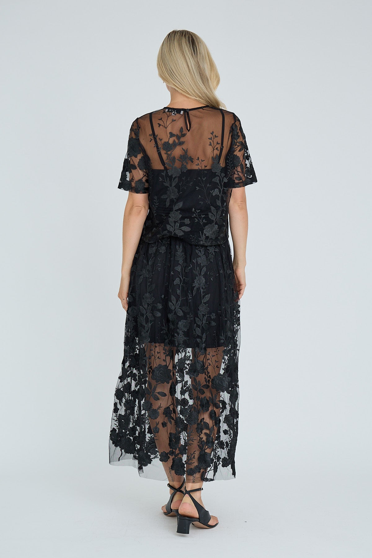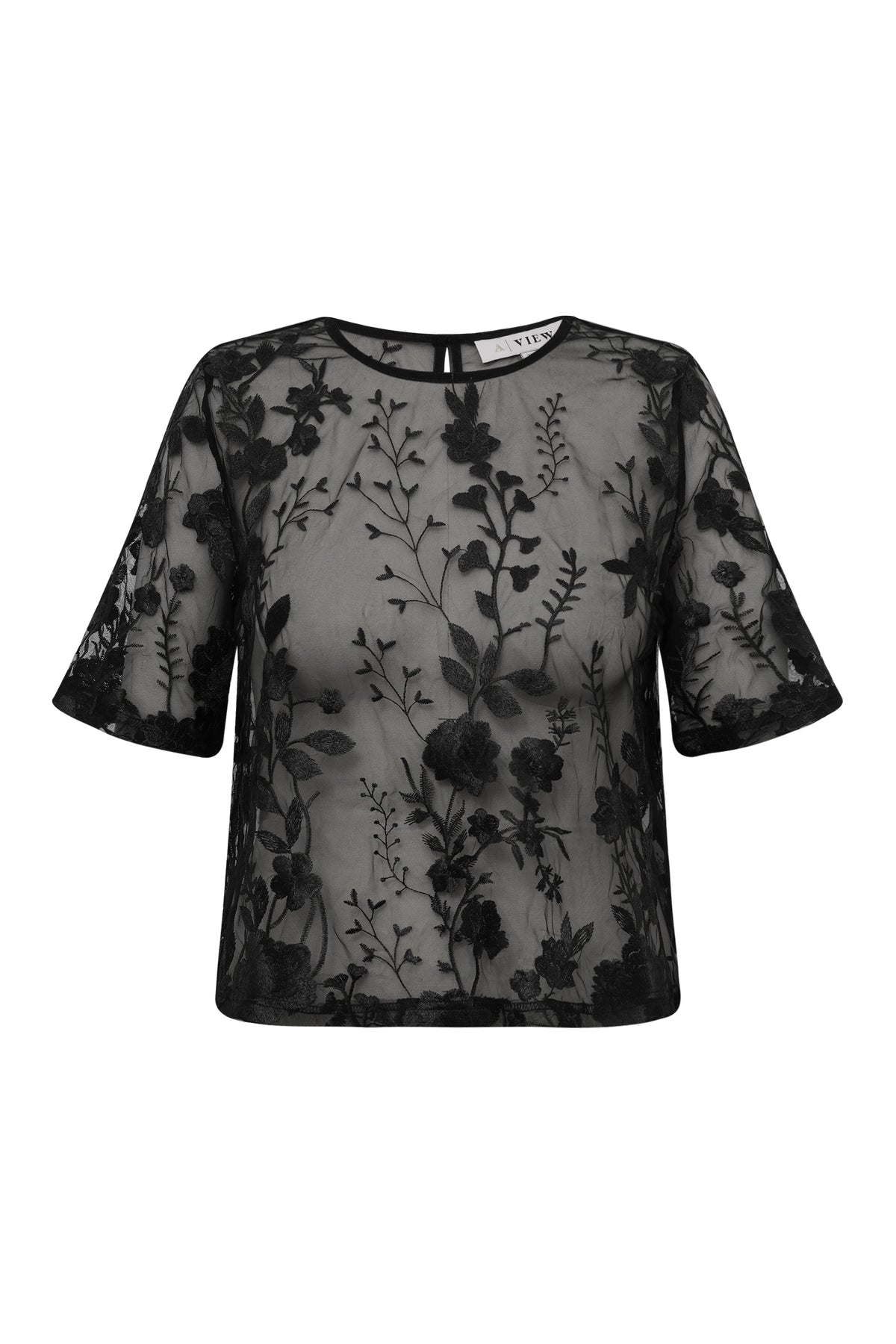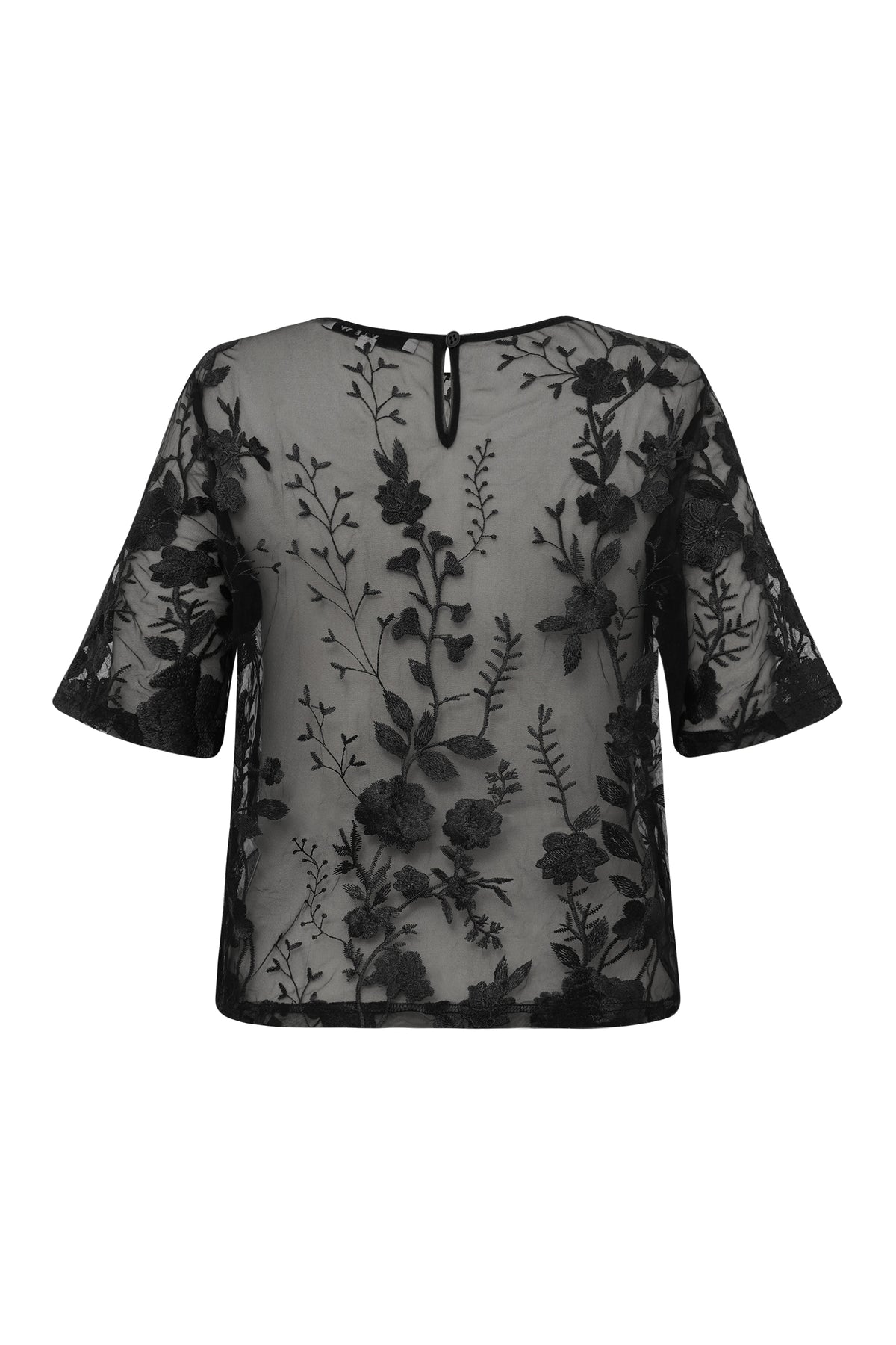 Fuschia pusero on naisellinen läpinäkyvästä verkkokankaasta valmistettu pusero, jossa on kauniita kirjailtuja kukkia. Puserossa on lyhyet, väljät hihat ja se suljetaan takaa napilla.