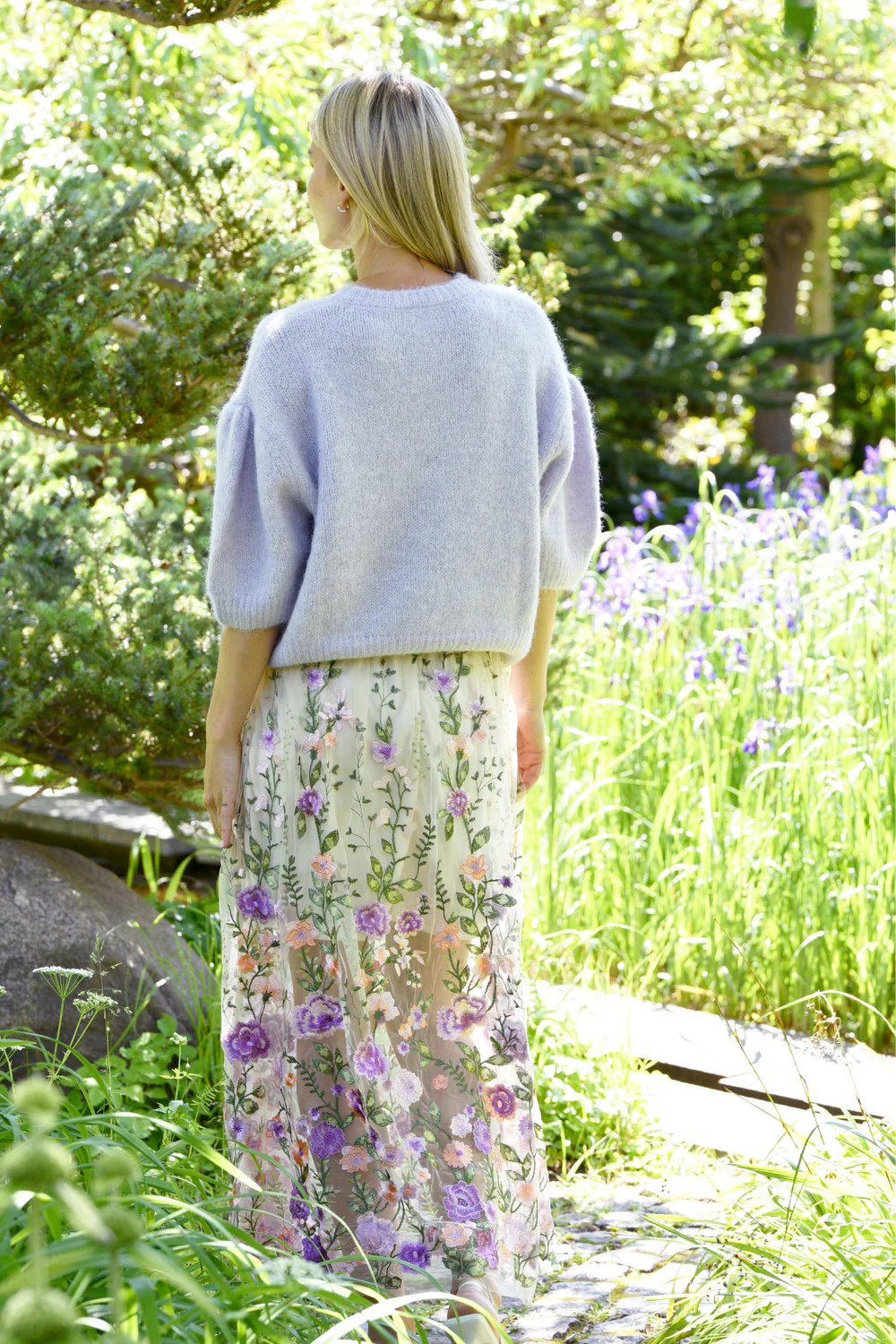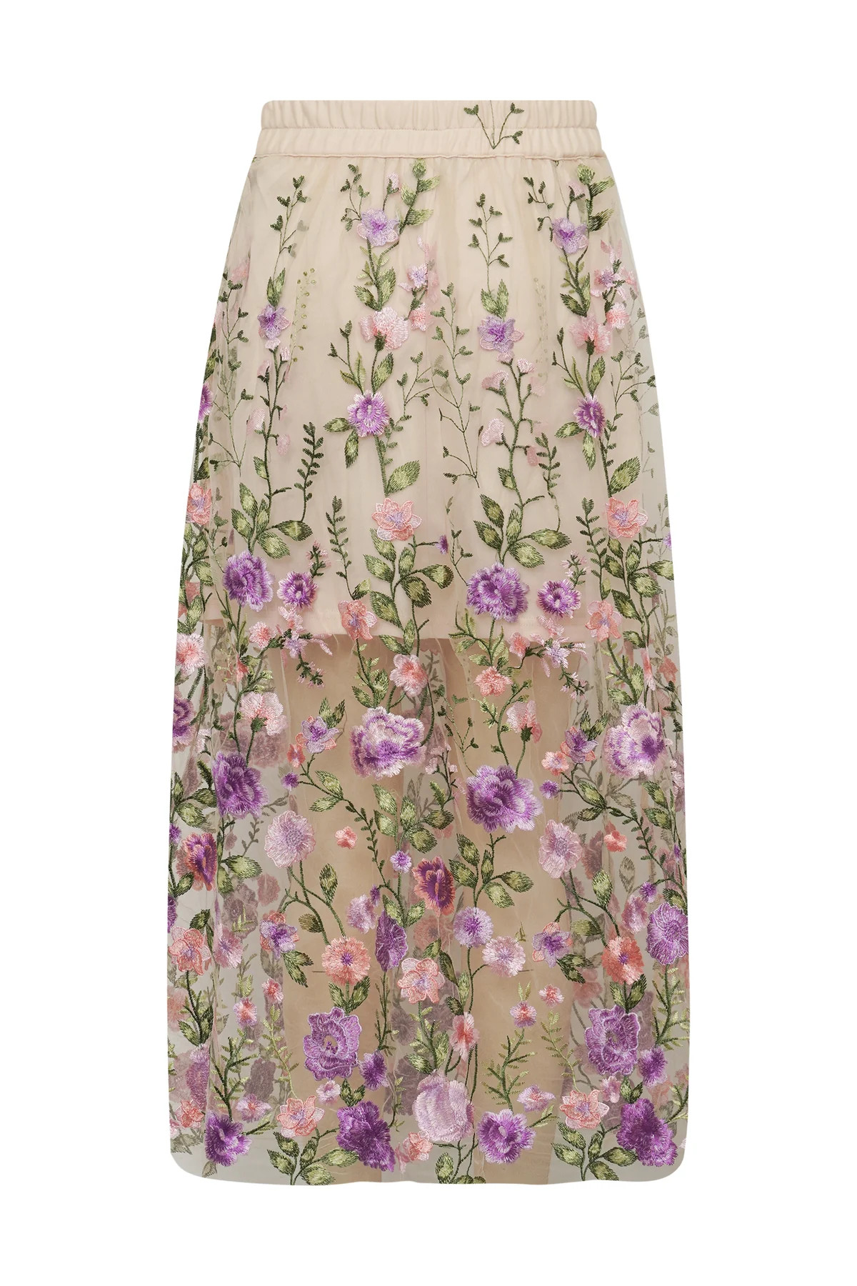 Fuschia-kjolen är en lång kjol i transparent mesh med broderier. Kjolen har en elastisk midja och kommer med en kortare underkjol.