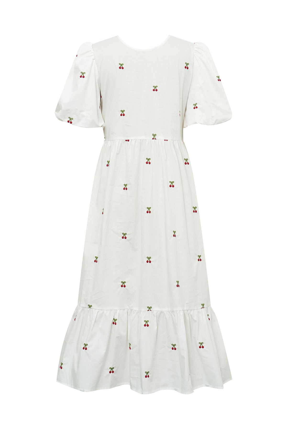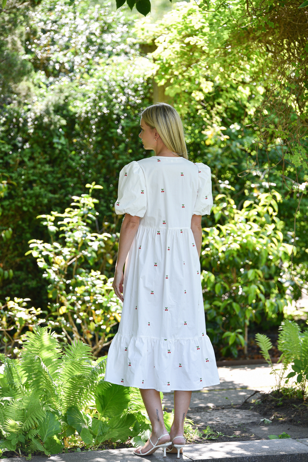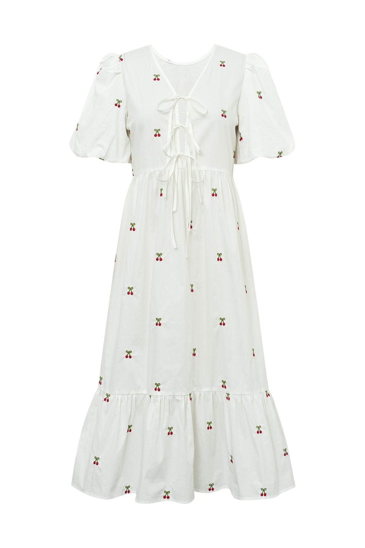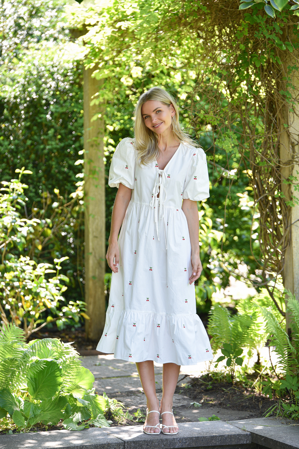 Lenore-mekko on naisellinen midimittainen mekko kevyestä ja miellyttävästä materiaalista, jossa on kaunis ja hillitty brodeerattu kirsikkakuvio. Mekossa on lyhyet puhvihihat, v-pääntie edessä olevalla solmittavalla nauhalla sekä kevyesti korostettu vyötärö, joka luo imartelevan siluetin.