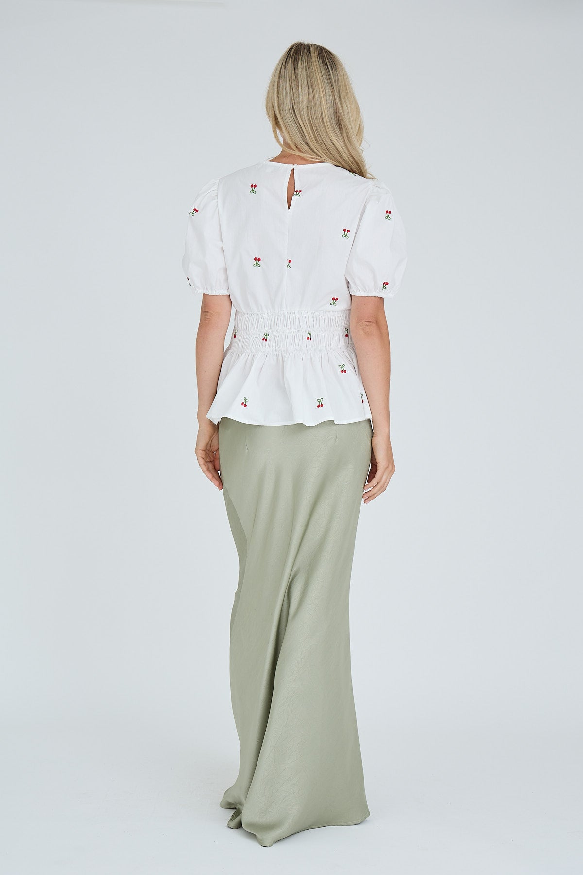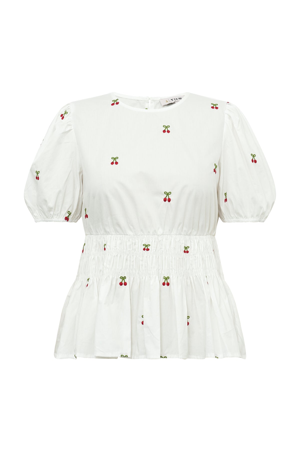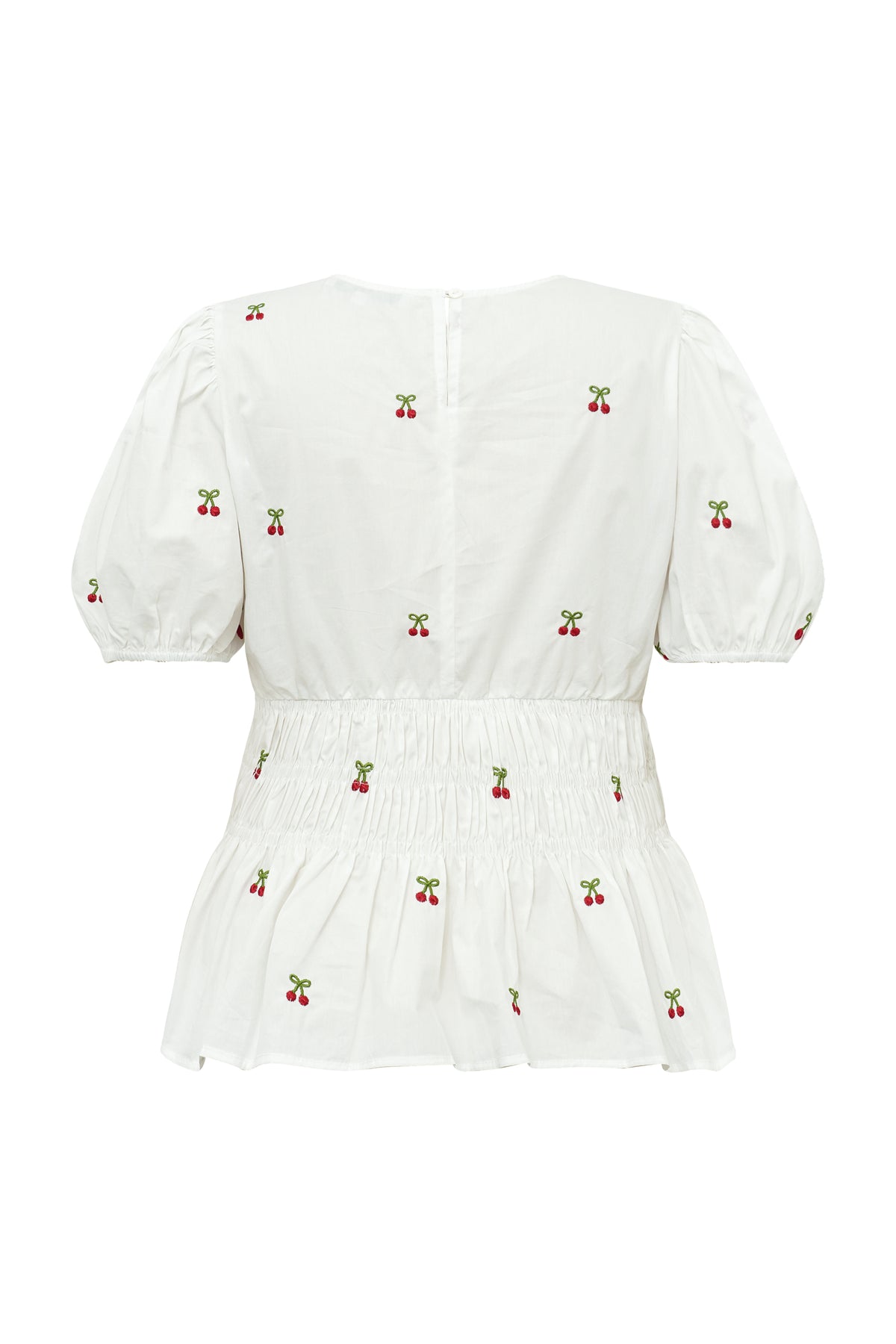 Leonore-pusero on naisellinen ja kevyt pusero ilmavasta materiaalista, jossa on kaunis kirsikkakuvio. Puserossa on lyhyet puhvihihat, pyöreä pääntie sekä vyötäröllä kuminauha, joka luo elegantin ja huolettoman ilmeen.