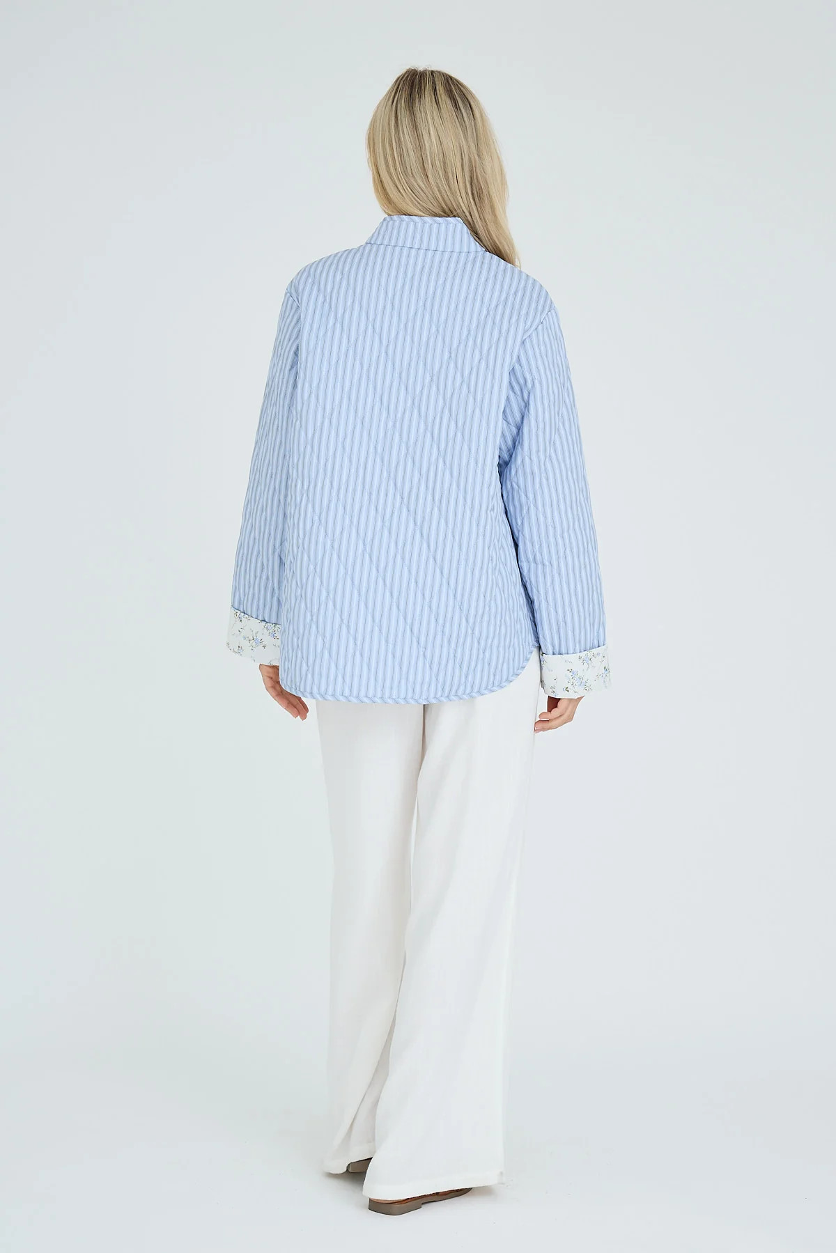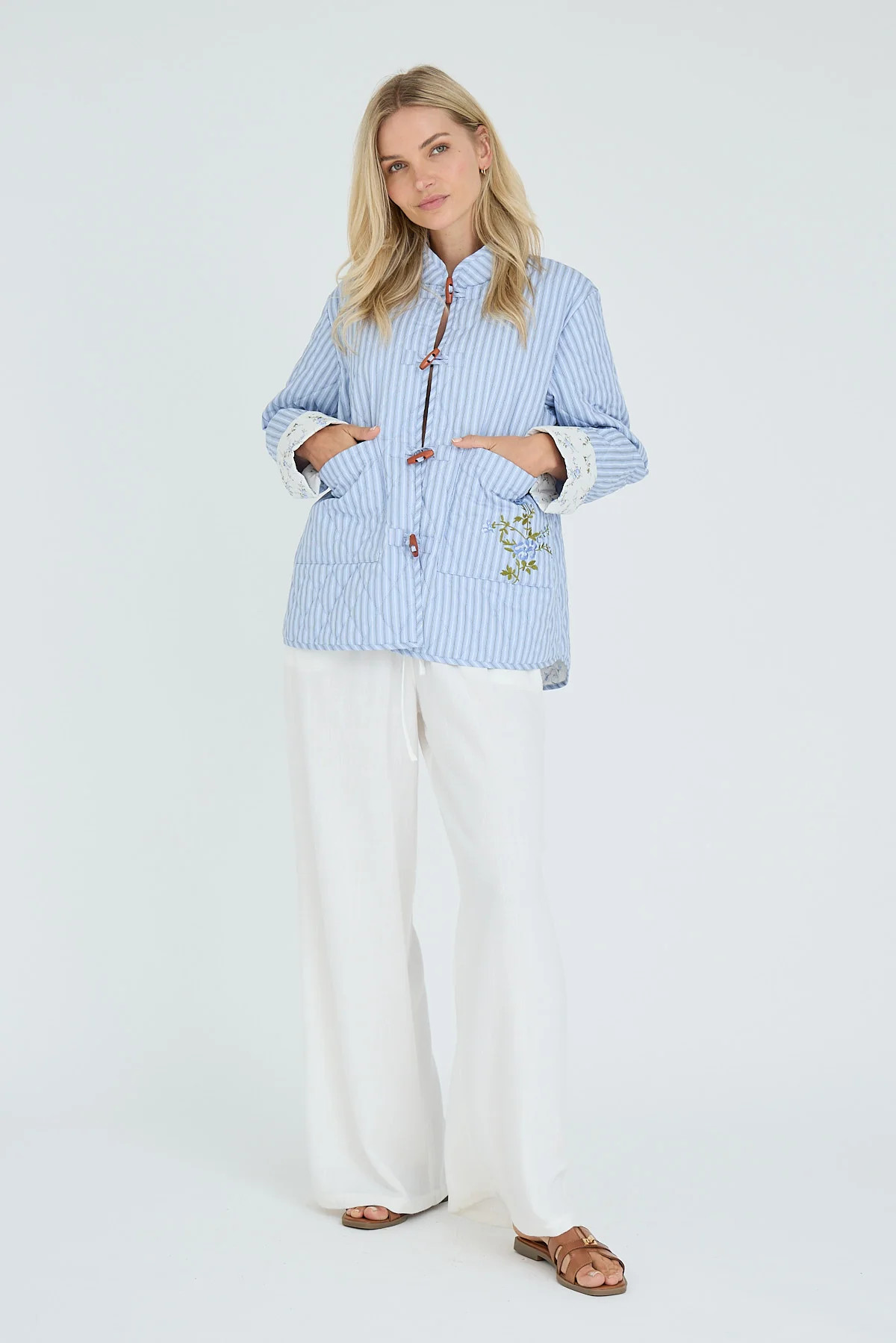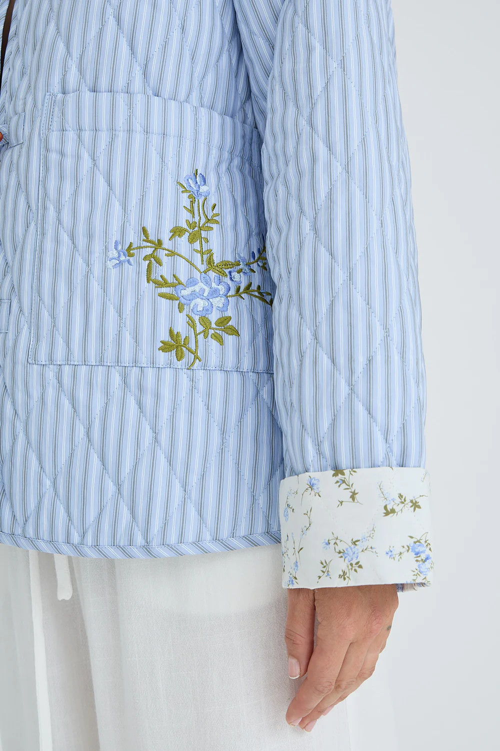 Libra jacket on kevyt, tikattu takki. Siinä on väljä istuvuus ja se suljetaan edestä. Takissa on suuret päällitaskut, hillitty brodeerattu kukkakuvio sekä kaunis kukkakuosinen kontrastivuori, joka näkyy hihojen käänteissä.