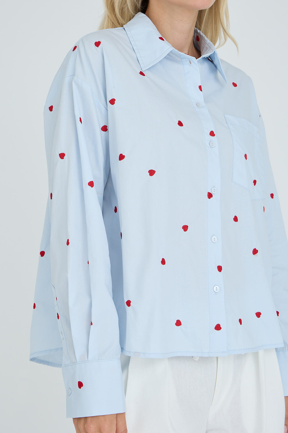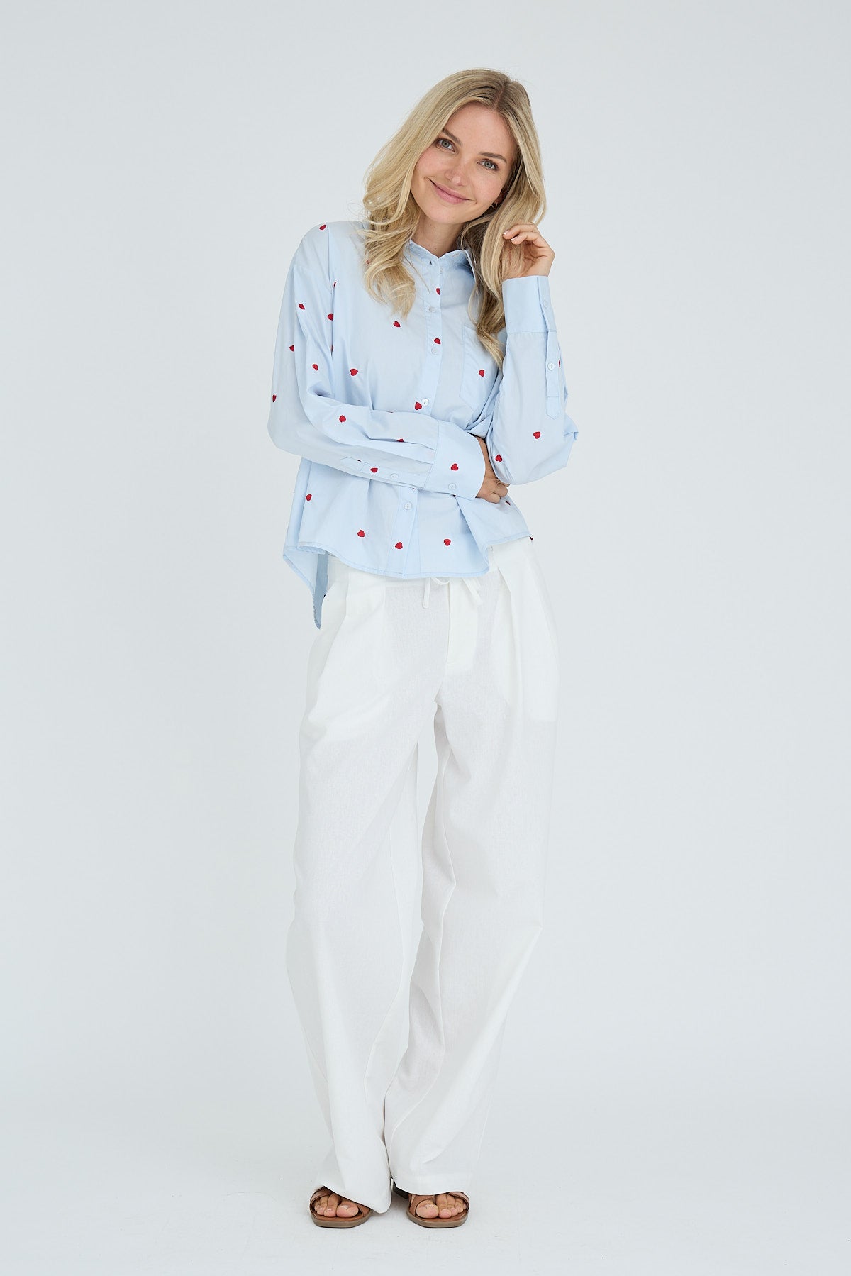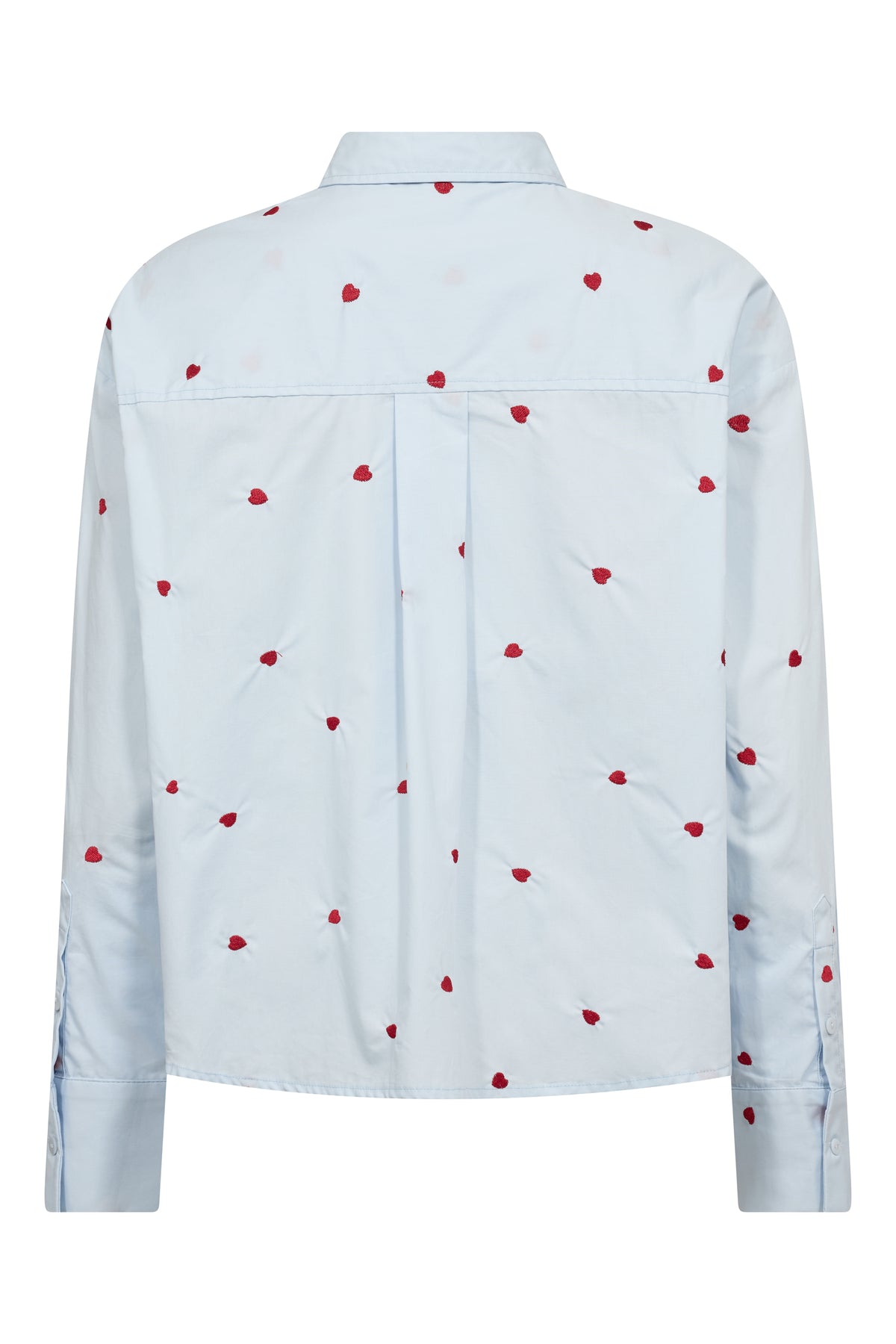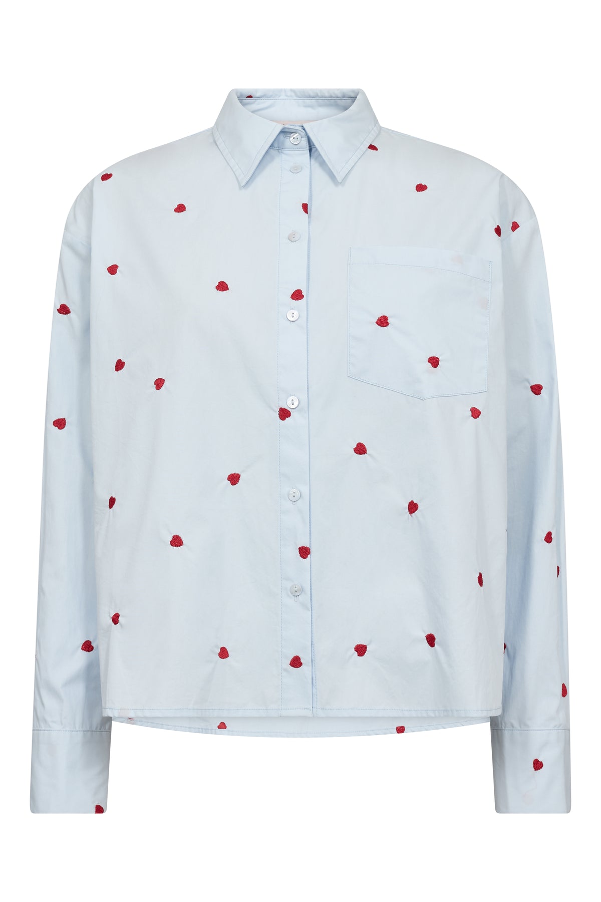 Monique-paita on klassinen ja naisellinen paita kevyestä ja miellyttävästä materiaalista. Pienet, brodeeratut sydämet tuovat siihen leikkisän ja elegantin ilmeen. Paidassa on pitkät hihat kalvosimilla, edessä napitus, klassinen kaulus sekä rento istuvuus, joka laskeutuu kauniisti vartalolle.