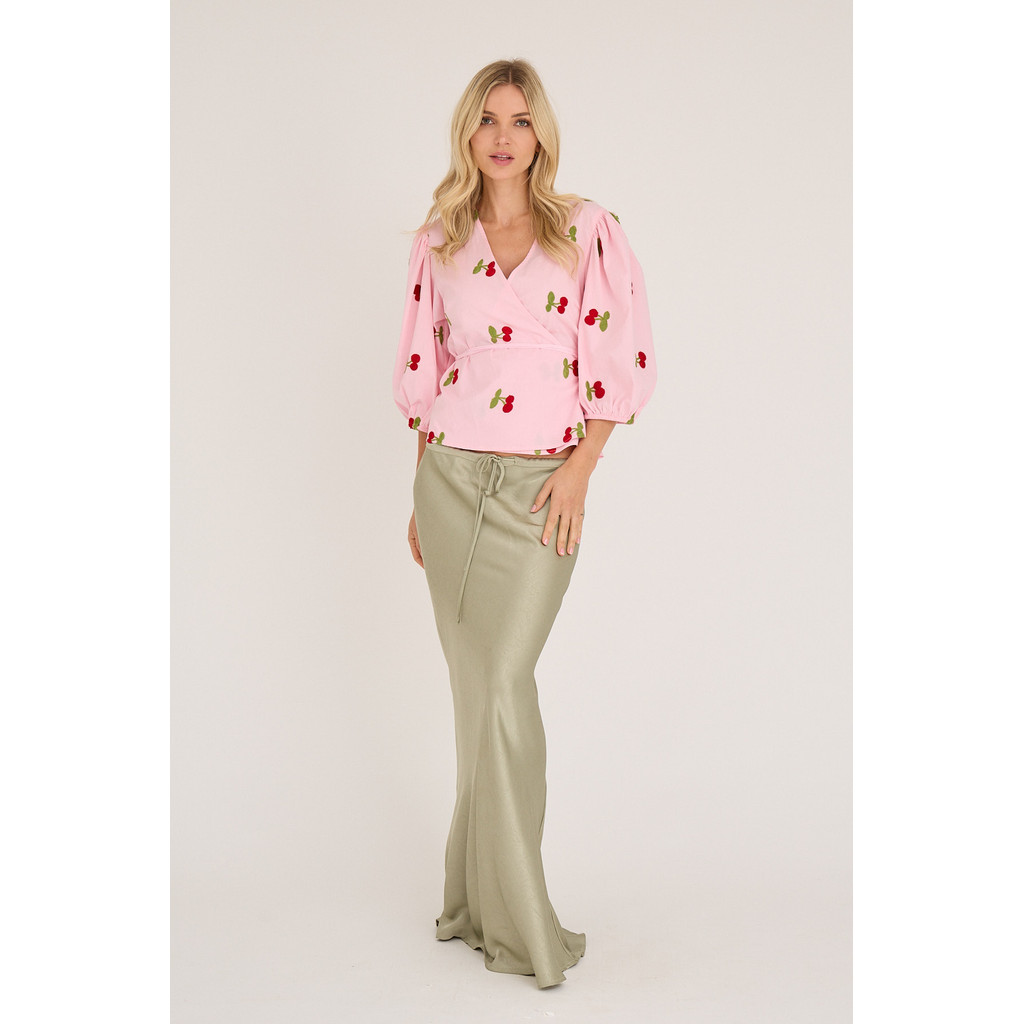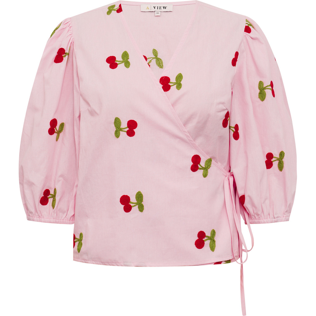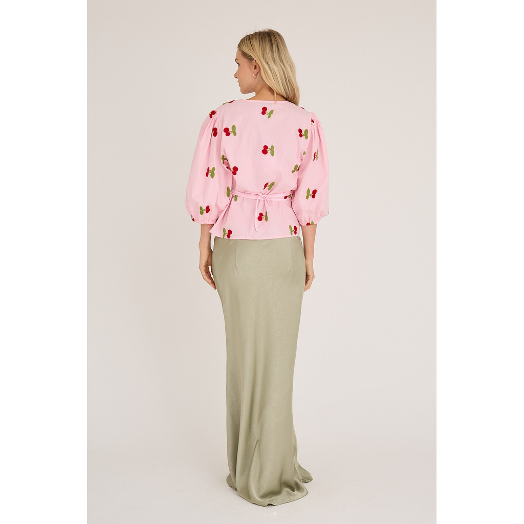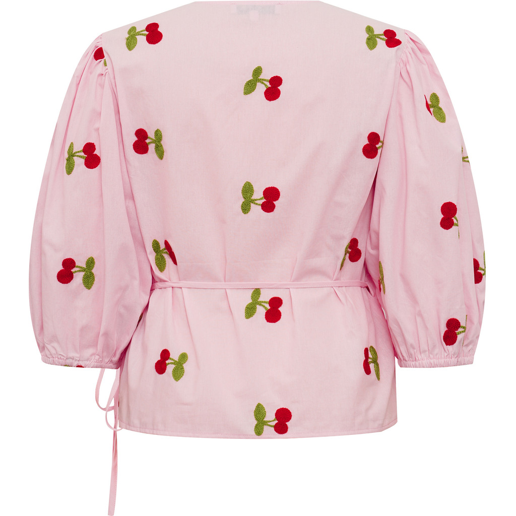 Rebekka-blusen är en feminin blus i ett lätt och behagligt material. De broderade körsbären ger den ett lekfullt men elegant uttryck. Blusen har en omlottknäppning och vackert fallande puffärmar.