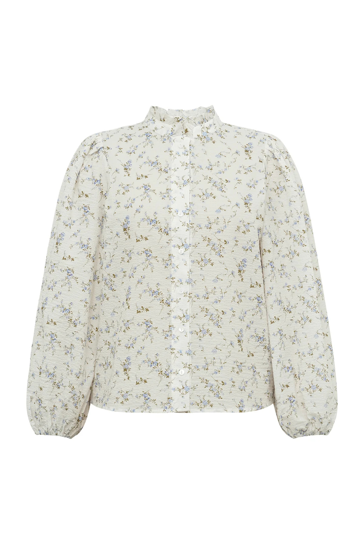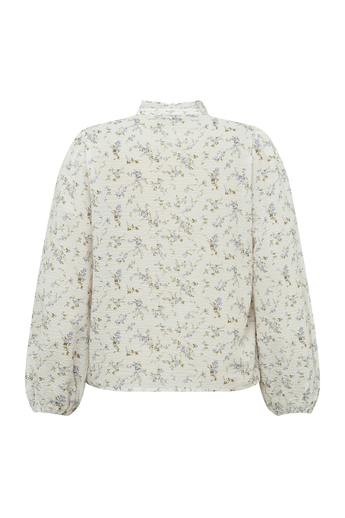 Tiffany pusero on väljä, pitkähihaine paita kauniilla kukkakuosilla ja korkealla röyhelökauluksella. Paidassa on hillityt ballonhihat ja se suljetaan edestä nappikiinnityksellä.