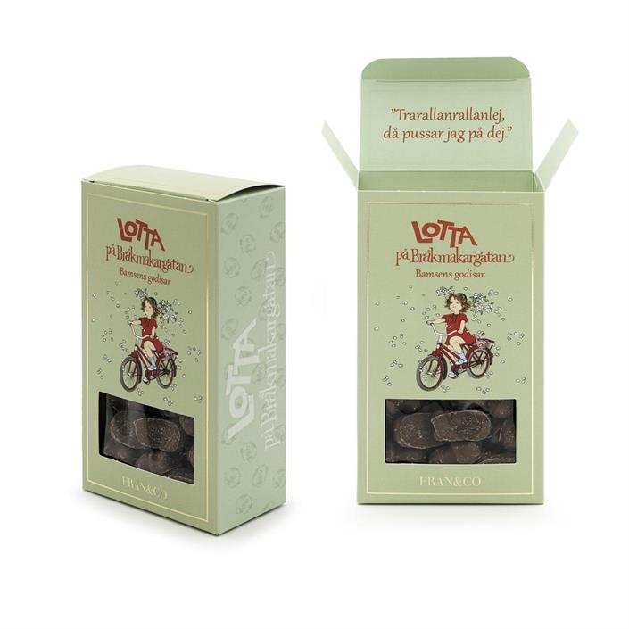 Ingredienser: Socker, glukos-fruktossirap, vatten, fullhärdade vegetabiliska oljor (palm*kärna, kokos, palm*), gelatin, vasslepulver (mjölk), fettreducerat kakaopulver, fuktighetsbevarande medel (sorbitol), skummjölkspulver, surhetsreglerande medel (citronsyra), emulgeringsmedel (sojalecitin, E492), aromämne, färgämne (E120).