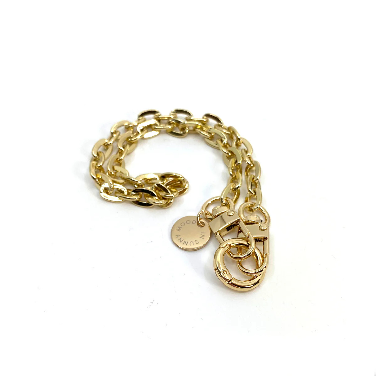 Flash Chain Multi Wristlet Gold är en elegant rem som låter dig bära, dekorera och ta med din telefon på ett stilfullt och sofistikerat sätt.