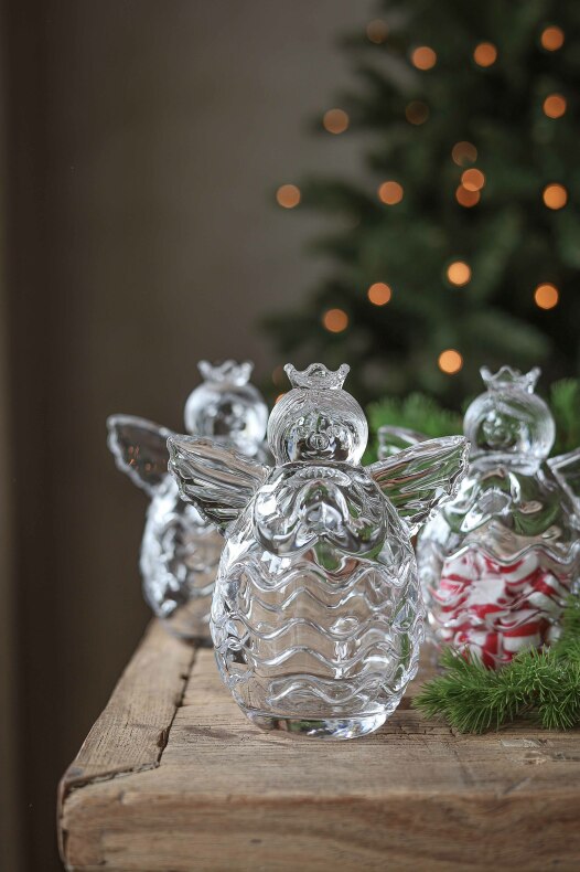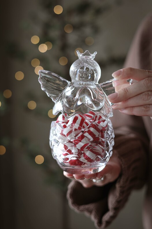 Söpö enkelin muotoinen lasipurkki. Täytä jouluherkuilla tai