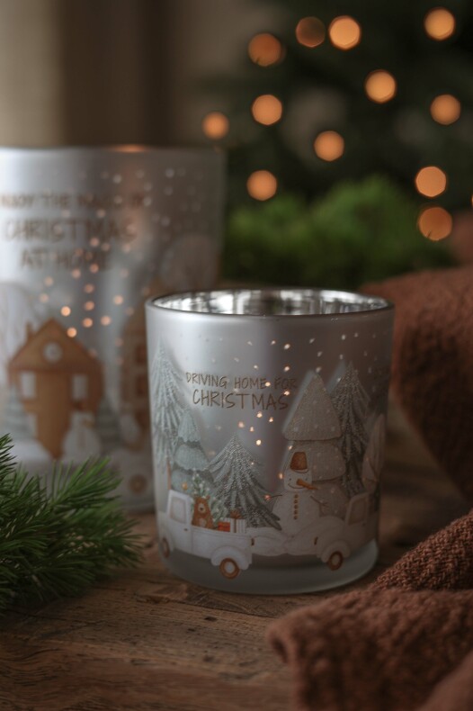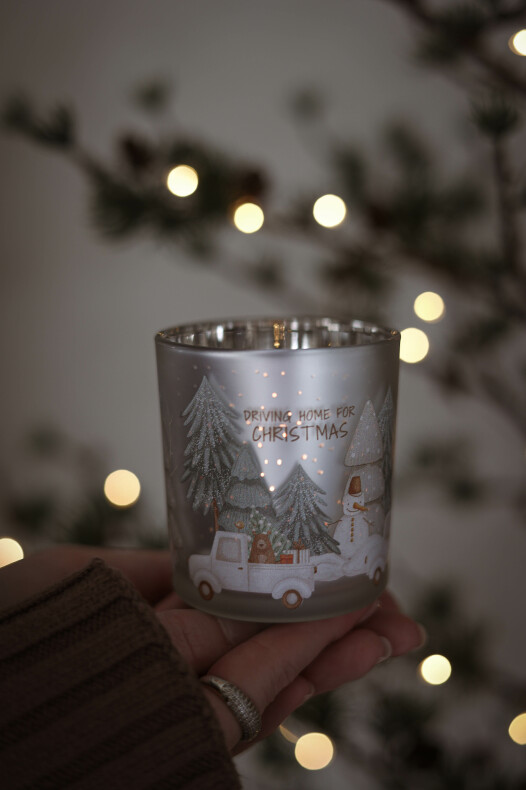 motiv av bil, granar och snö samt text: Driving home for Christmas.