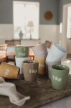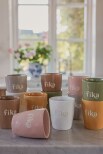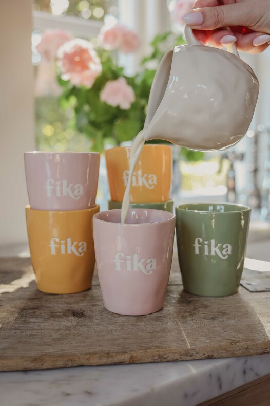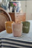 Ljuvliga muggar i glada färger med silkscreen text i keramiken