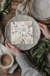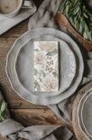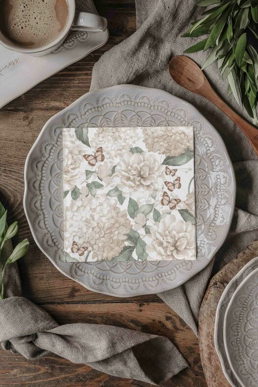 Servett med vackert vårigt mönster av hortensior och fjärilar i sobra toner