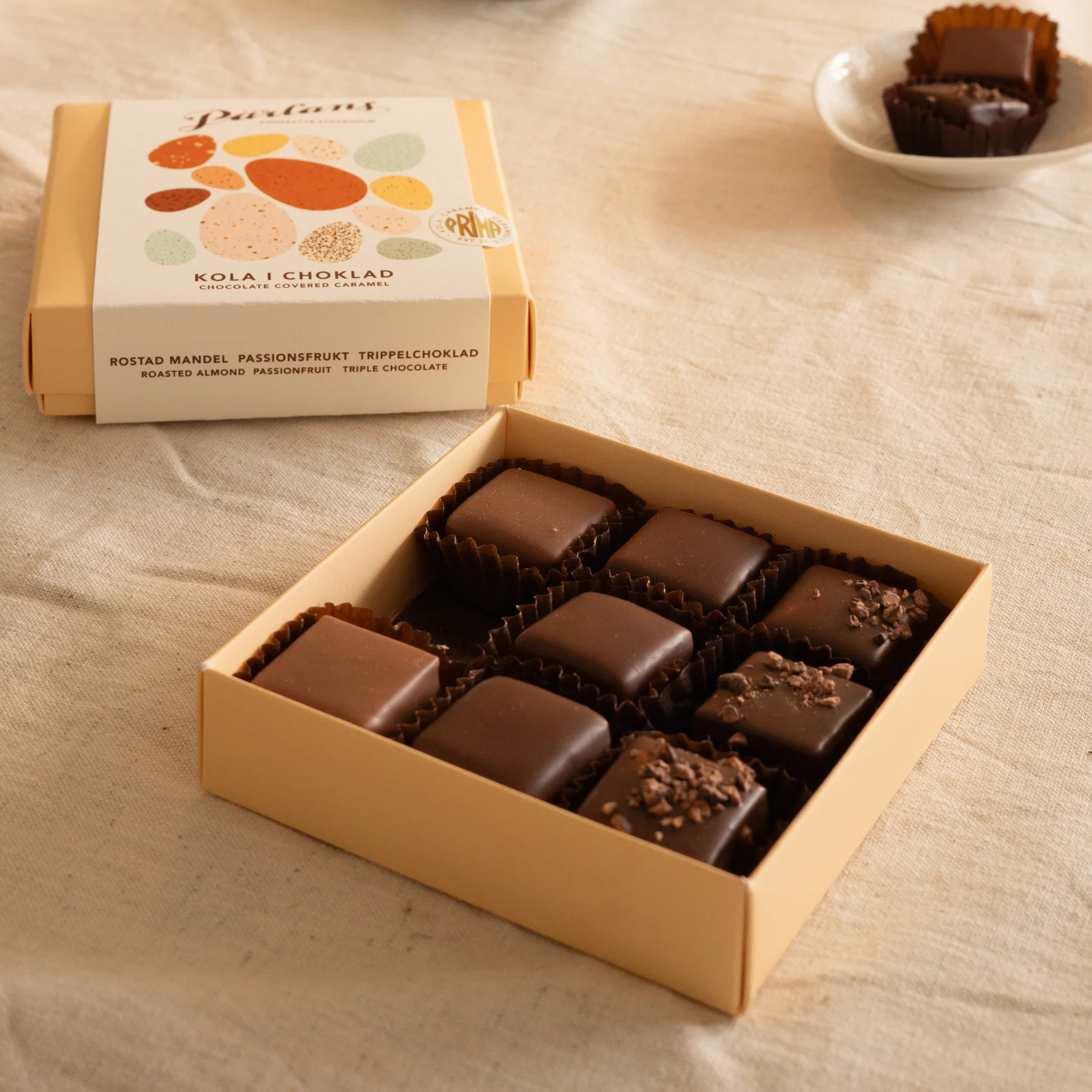 Yhdeksän pehmeää karamellia, dipattu tummaan tai vaaleaan luomusuklaaseen. Laatikosta löydät pääsiäisen maukkaimmat herkut, jotka herättävät kevään eloon – paahdettua mantelia kevyellä suolalla, kirpeää passionhedelmää ja täyteläistä suklaakaramellia, joka on koristeltu kaakaorouheella.